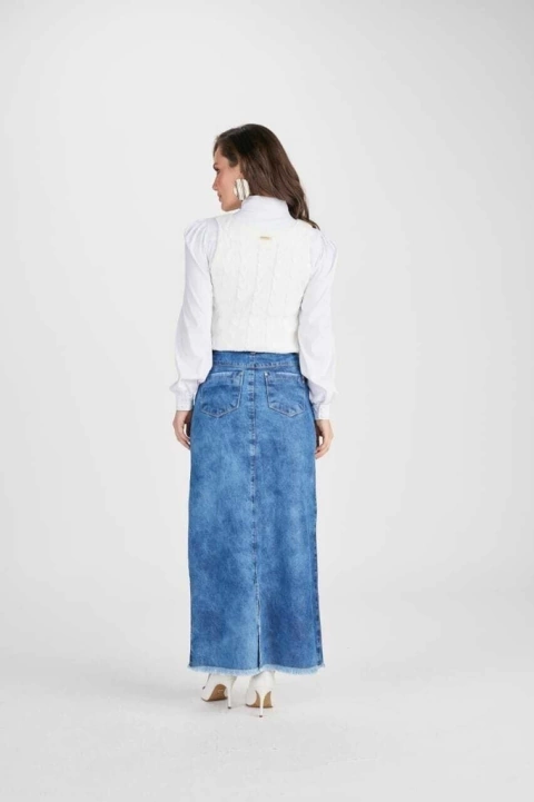 Saia Jeans Titanium desenvolvida em jeans sustentável com lavanderia Sky médio em cor Azul. Cheia de personalidade a peça é Destroyed por conta de seus puídos e fusionados em sua parte frontal e ralados nos bolsos sendo tendência. Conta com racho frontal e barra assimétrica desfiada. Apresenta bolsos frontais e traseiros funcionais, Possuí fechamento frontal em zíper e botão. Com modelagem mais solta e comprimento longo a peça veio para vestir bem todos os biótipos femininos. Possuí pesponto em cor Cáqui e aviamentos em dourado. Essa peça faz parte da linha sustentável e foi confeccionada através de técnicas de produção que minimizam significativamente o uso de água durante seu processo de criação. Composição:100% algodão.