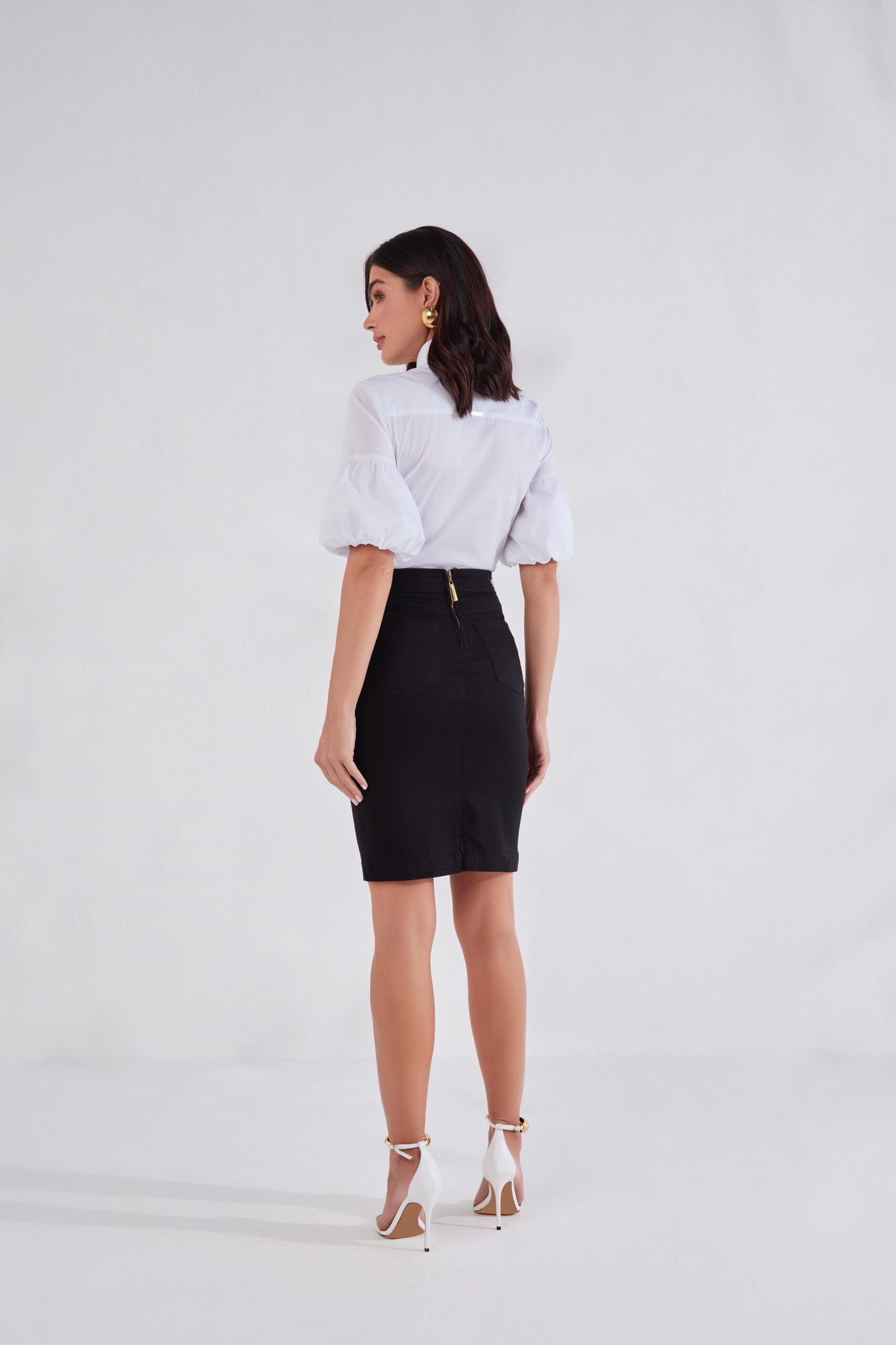 Saia reta black confeccionada em tecido de altíssima qualidade, cor de linha preta, aviamentos em banho dourado e lavanderia amaciada.