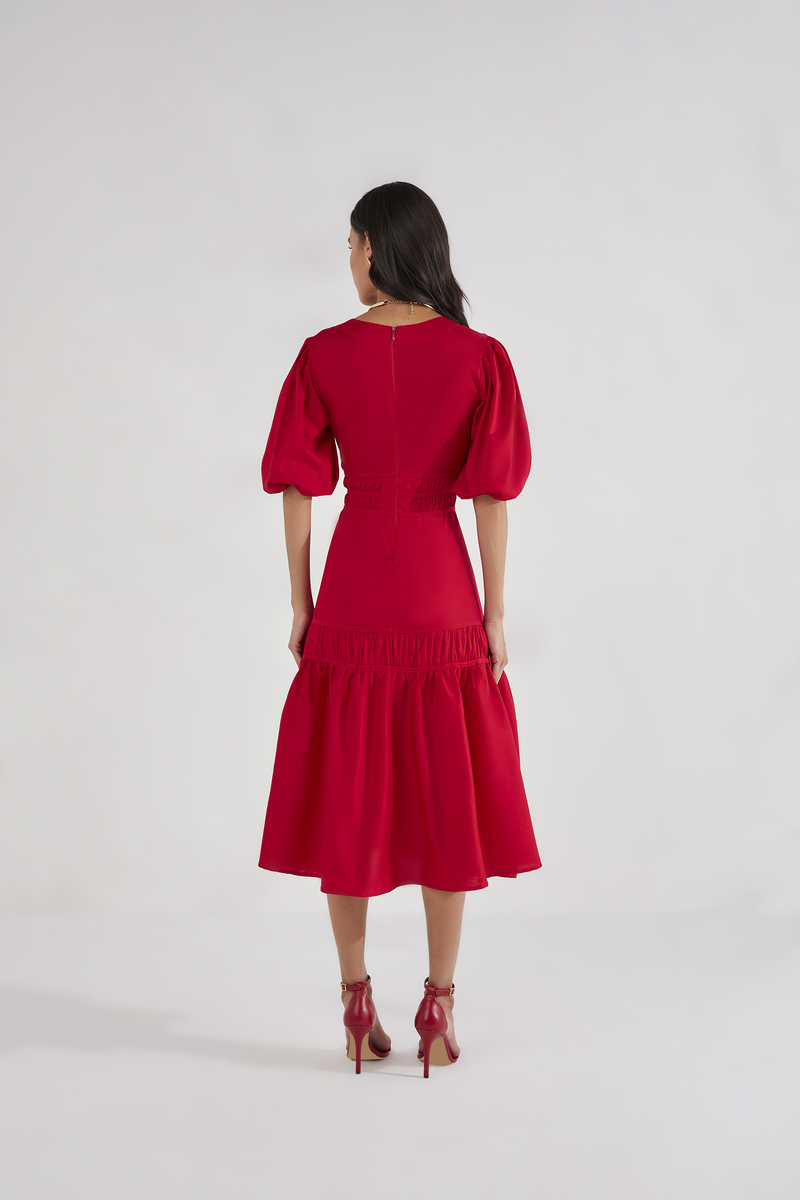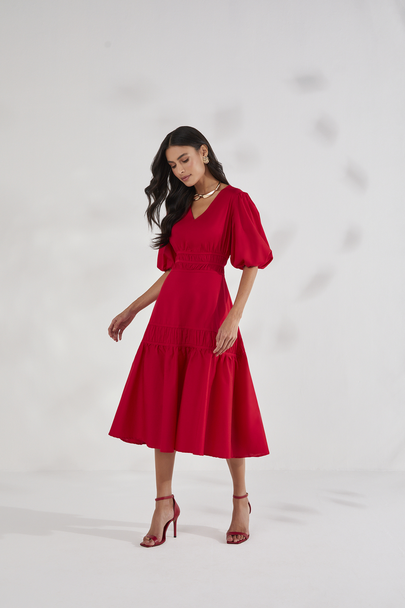 Vestido vermelho confeccionado em tecido de altíssima qualidade, cor de linha vermelho, aviamentos em banho dourado, fechamento traseiro em zíper, manga bufante com . elástico e detalhe em lastex . Comprimento 120cm